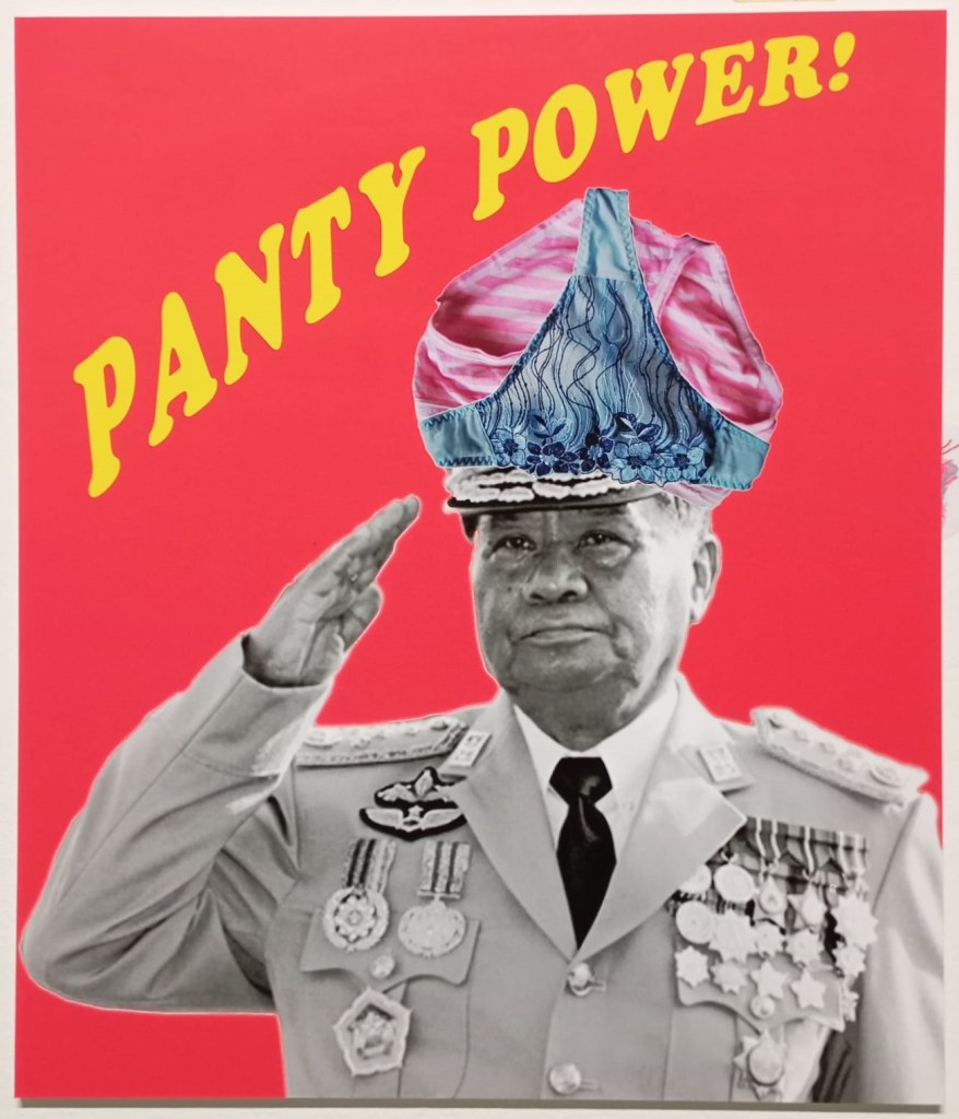 Two works stay with me. One is Panties for Peace, a reference to the protest campaign launched by Burmese women in exile in 2007. In response to the regime’s violent crackdown on the Saffron Revolution, these women called on supporters to send their used underwear to Burmese embassies. It was ridiculous and sharp at once — used panties mailed in protest, aimed right at a regime scared of women’s bodies. That’s what stuck with me. The softness wasn’t soft. It was charged. Funny, angry, intimate. A kind of protest that giggles while it cuts. The Biennale’s display doesn’t reconstruct the campaign in full, but its spirit hangs in the air — delicately sewn, suspended, and sharp-edged.